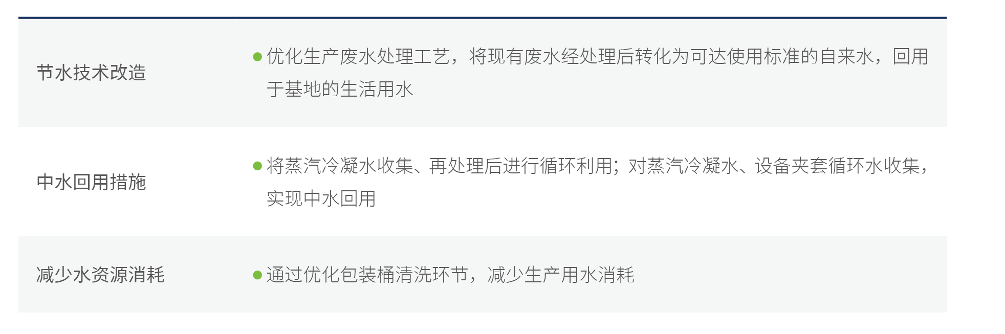 公司致力减少生产运营对水资源的依赖性,以降低水资源消耗、提升水资源使用效率为原则,多措并举减少水资源的使用。2024年,公司制定了《节水管理制度》,并持续探索生产环节的节水与循环用水潜力,推进节水技术创新与应用。2024年,我们在所有子公司及基地的开展水资源消耗分析,推广最佳节水技术,并通过多元用水,降低水资源使用量。