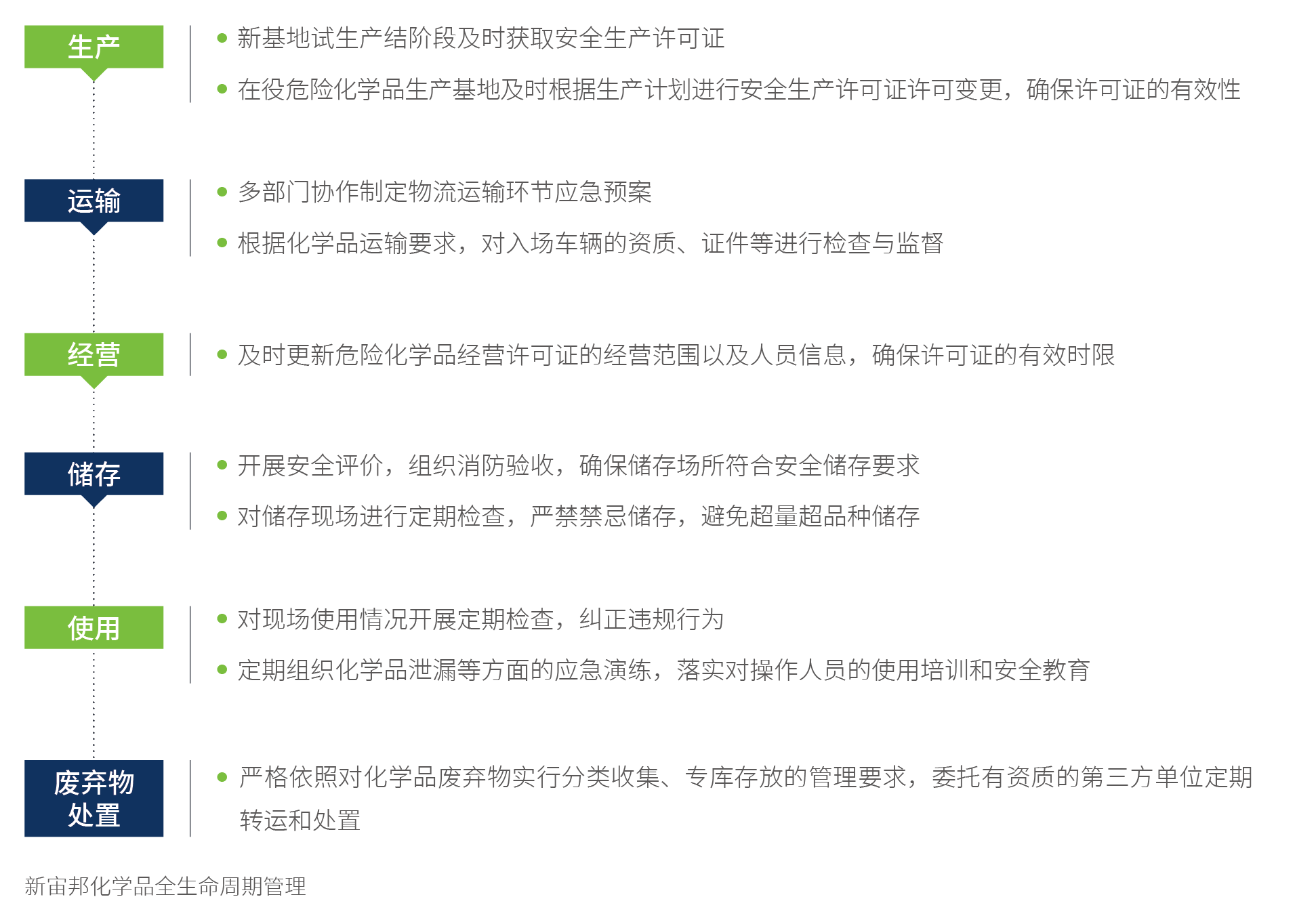 公司全面落实化学品的全生命周期管理,紧扣风险识别、有害化学品削减与替代、化学品安全保障三大关键维度, 构建“一书一签”管理机制,对不同种类化学品的“生产-运输-经营-储存-使用-废弃物处置”全流程进行严格管控,形成高效闭环管理机制,降低化学品的潜在风险和不良影响。